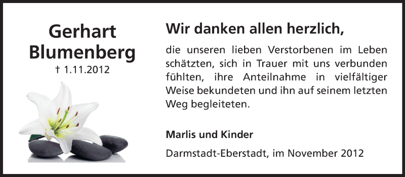 Hier finden Sie alle Traueranzeigen aus der Zeitung, die bisher für Gerhart Blumenberg erschienen sind. Weitere Traueranzeigen, die in der Zeitung erscheinen, werden hier ebenfalls aufgelistet
