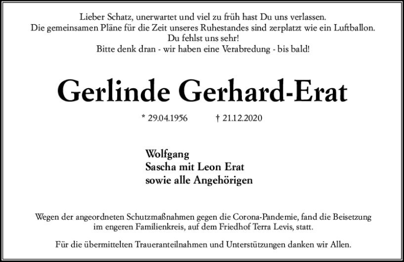 Hier finden Sie alle Traueranzeigen aus der Zeitung, die bisher für Gerlinde Gerhard-Erat erschienen sind. Weitere Traueranzeigen, die in der Zeitung erscheinen, werden hier ebenfalls aufgelistet