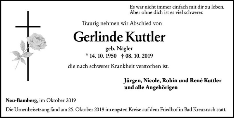 Hier finden Sie alle Traueranzeigen aus der Zeitung, die bisher für Gerlinde Kuttler erschienen sind. Weitere Traueranzeigen, die in der Zeitung erscheinen, werden hier ebenfalls aufgelistet
