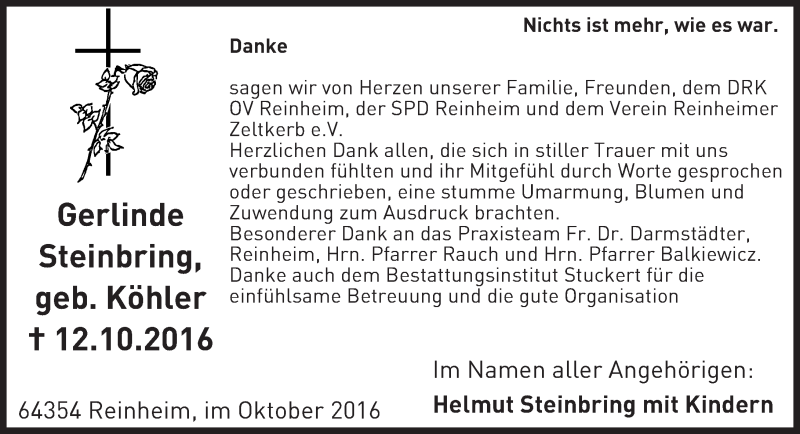 Hier finden Sie alle Traueranzeigen aus der Zeitung, die bisher für Gerlinde Steinbring erschienen sind. Weitere Traueranzeigen, die in der Zeitung erscheinen, werden hier ebenfalls aufgelistet
