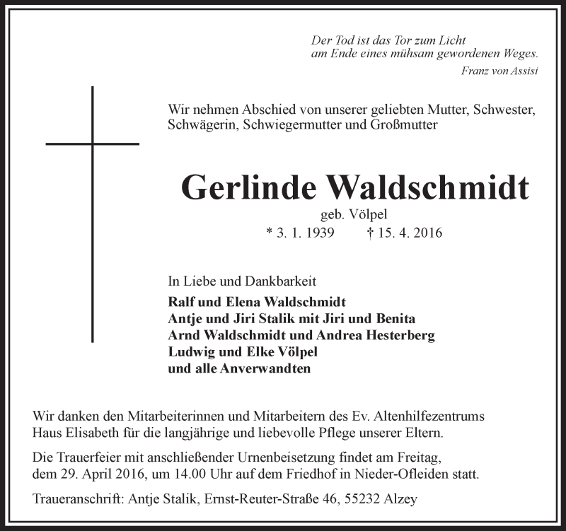 Hier finden Sie alle Traueranzeigen aus der Zeitung, die bisher für Gerlinde Waldschmidt erschienen sind. Weitere Traueranzeigen, die in der Zeitung erscheinen, werden hier ebenfalls aufgelistet