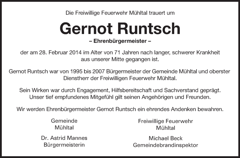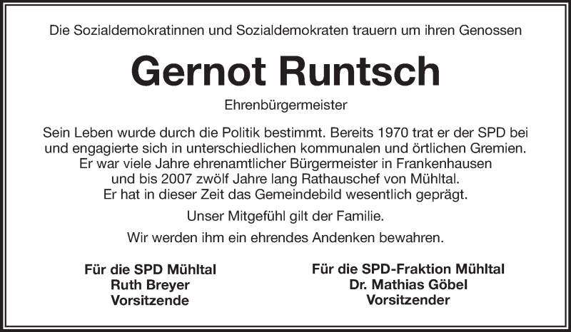 Hier finden Sie alle Traueranzeigen aus der Zeitung, die bisher für Gernot Runtsch erschienen sind. Weitere Traueranzeigen, die in der Zeitung erscheinen, werden hier ebenfalls aufgelistet