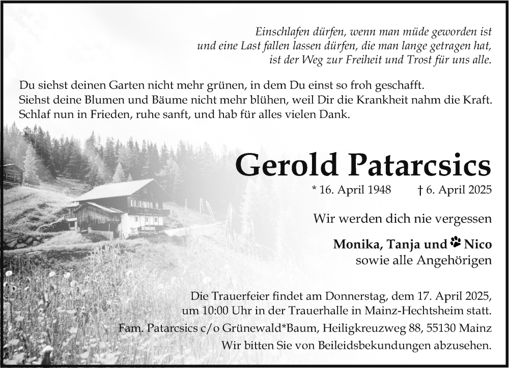 Hier finden Sie alle Traueranzeigen aus der Zeitung, die bisher für Gerold Patarcsics erschienen sind. Weitere Traueranzeigen, die in der Zeitung erscheinen, werden hier ebenfalls aufgelistet