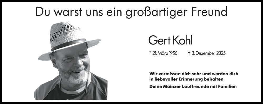 Hier finden Sie alle Traueranzeigen aus der Zeitung, die bisher für Gert Kohl erschienen sind. Weitere Traueranzeigen, die in der Zeitung erscheinen, werden hier ebenfalls aufgelistet
