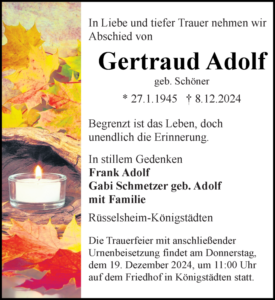 Hier finden Sie alle Traueranzeigen aus der Zeitung, die bisher für Gertraud Adolf erschienen sind. Weitere Traueranzeigen, die in der Zeitung erscheinen, werden hier ebenfalls aufgelistet