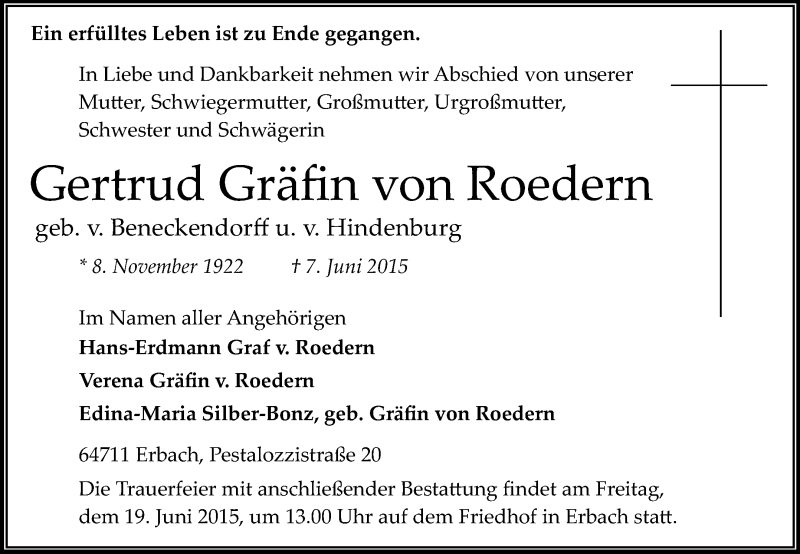 Hier finden Sie alle Traueranzeigen aus der Zeitung, die bisher für Gertrud Gräfin von Roedern erschienen sind. Weitere Traueranzeigen, die in der Zeitung erscheinen, werden hier ebenfalls aufgelistet