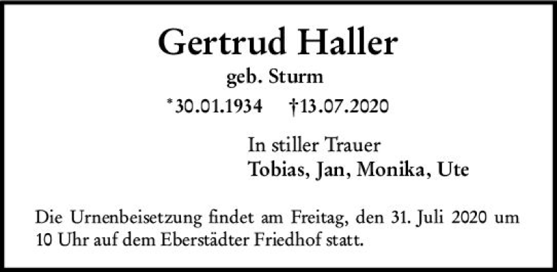 Hier finden Sie alle Traueranzeigen aus der Zeitung, die bisher für Gertrud Haller erschienen sind. Weitere Traueranzeigen, die in der Zeitung erscheinen, werden hier ebenfalls aufgelistet