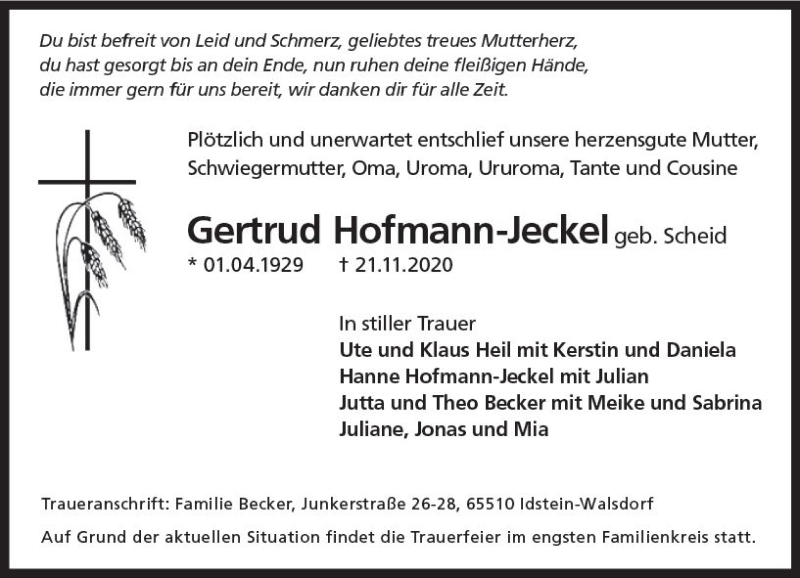 Hier finden Sie alle Traueranzeigen aus der Zeitung, die bisher für Gertrud Hofmann-Jeckel erschienen sind. Weitere Traueranzeigen, die in der Zeitung erscheinen, werden hier ebenfalls aufgelistet