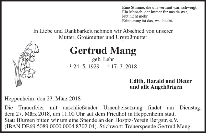 Hier finden Sie alle Traueranzeigen aus der Zeitung, die bisher für Gertrud Mang erschienen sind. Weitere Traueranzeigen, die in der Zeitung erscheinen, werden hier ebenfalls aufgelistet