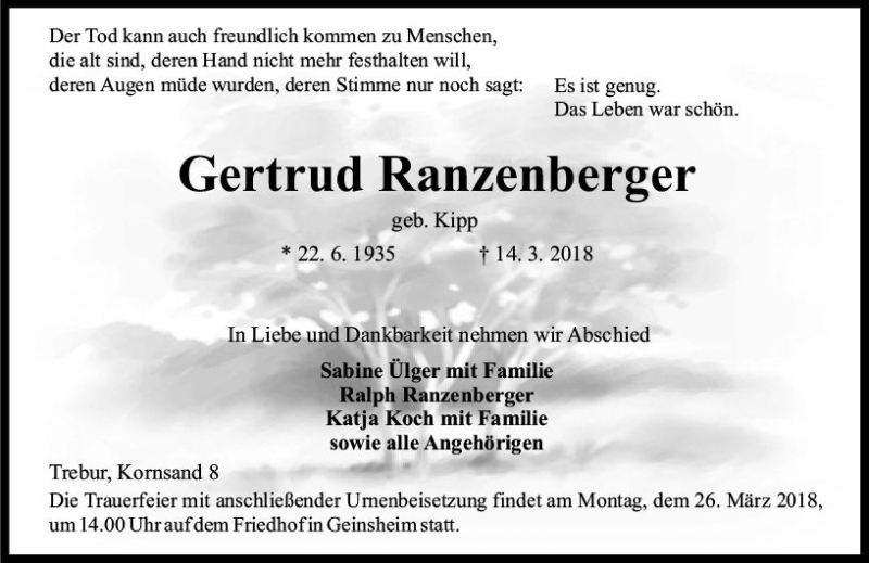 Hier finden Sie alle Traueranzeigen aus der Zeitung, die bisher für Gertrud Ranzenberger erschienen sind. Weitere Traueranzeigen, die in der Zeitung erscheinen, werden hier ebenfalls aufgelistet
