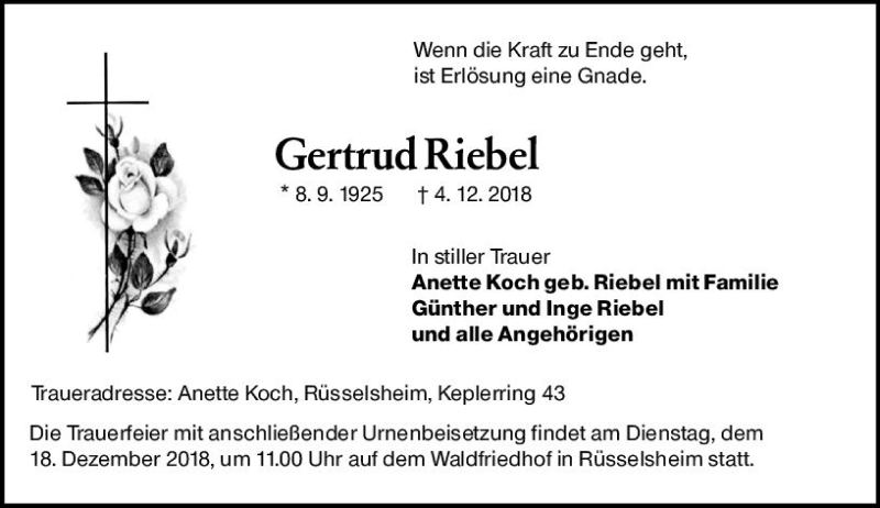 Hier finden Sie alle Traueranzeigen aus der Zeitung, die bisher für Gertrud Riebel erschienen sind. Weitere Traueranzeigen, die in der Zeitung erscheinen, werden hier ebenfalls aufgelistet