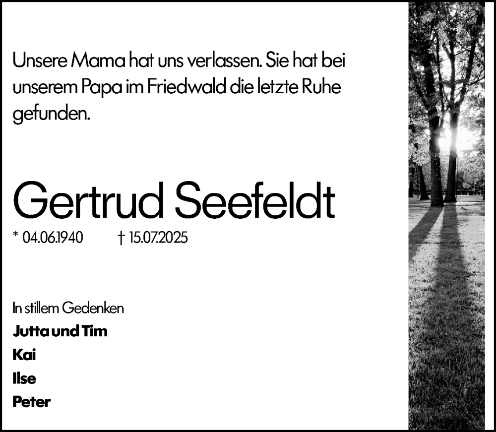 Hier finden Sie alle Traueranzeigen aus der Zeitung, die bisher für Gertrud Seefeldt erschienen sind. Weitere Traueranzeigen, die in der Zeitung erscheinen, werden hier ebenfalls aufgelistet