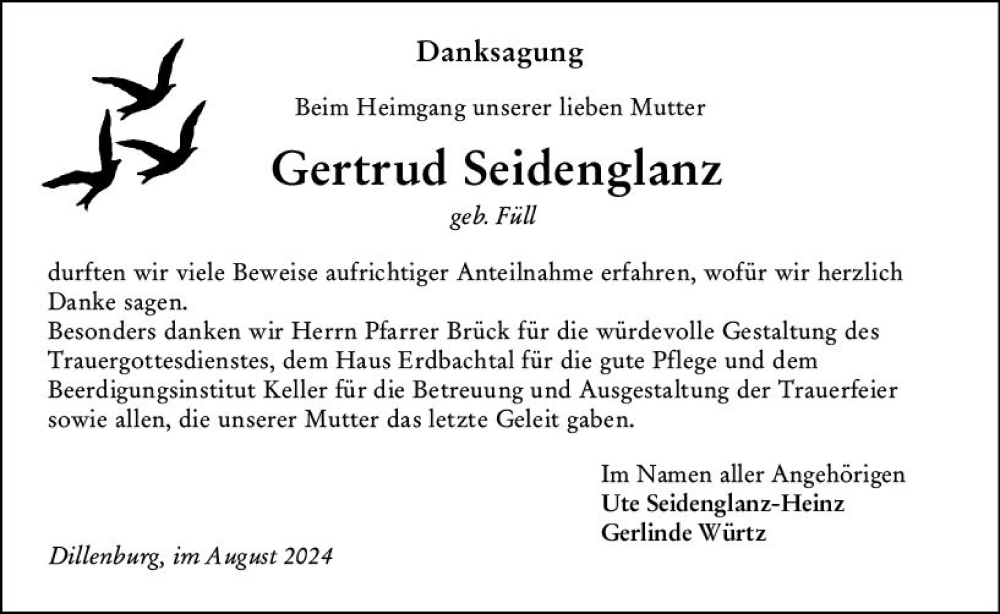 Hier finden Sie alle Traueranzeigen aus der Zeitung, die bisher für Gertrud Seidenglanz erschienen sind. Weitere Traueranzeigen, die in der Zeitung erscheinen, werden hier ebenfalls aufgelistet
