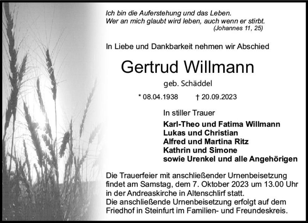 Hier finden Sie alle Traueranzeigen aus der Zeitung, die bisher für Gertrud Willmann erschienen sind. Weitere Traueranzeigen, die in der Zeitung erscheinen, werden hier ebenfalls aufgelistet