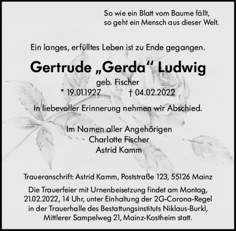 Hier finden Sie alle Traueranzeigen aus der Zeitung, die bisher für Gertrude Ludwig erschienen sind. Weitere Traueranzeigen, die in der Zeitung erscheinen, werden hier ebenfalls aufgelistet