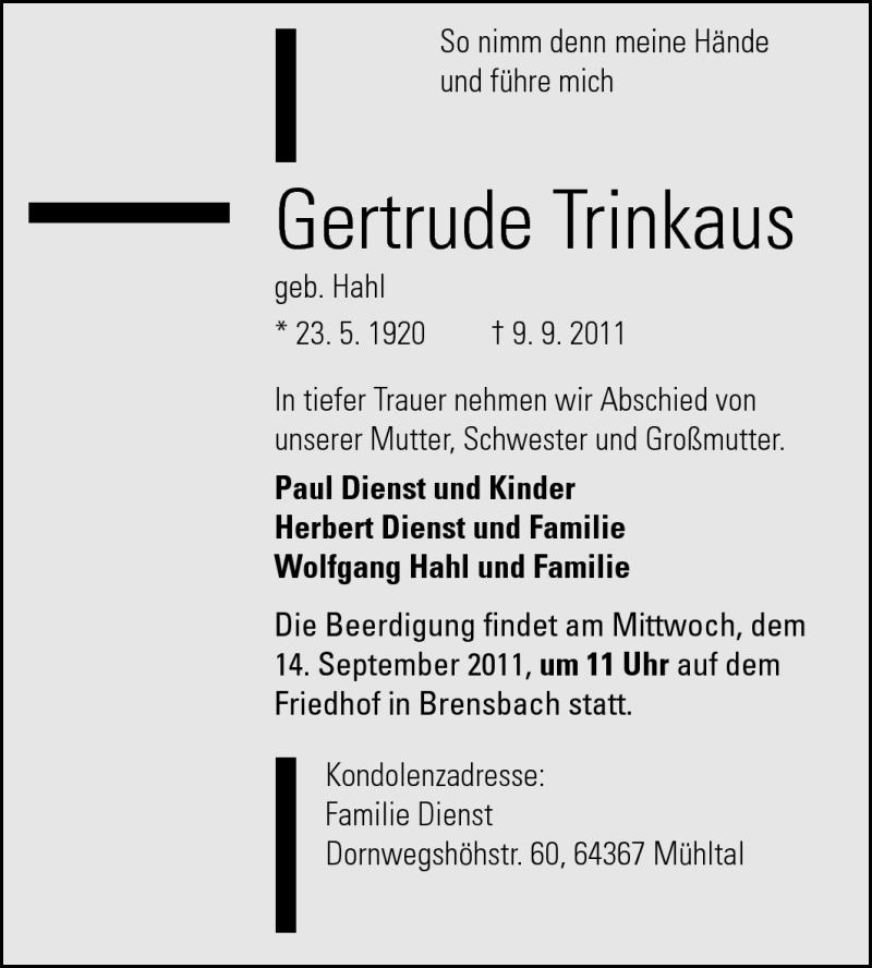 Hier finden Sie alle Traueranzeigen aus der Zeitung, die bisher für Gertrude Trinkaus erschienen sind. Weitere Traueranzeigen, die in der Zeitung erscheinen, werden hier ebenfalls aufgelistet
