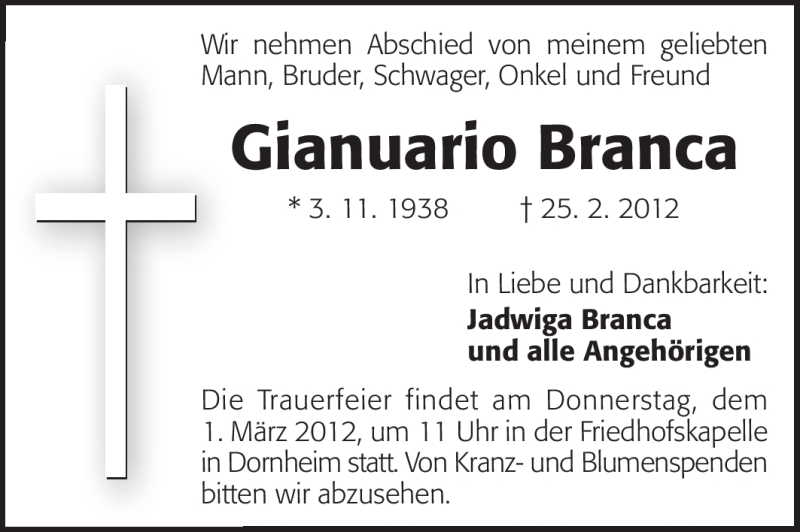 Hier finden Sie alle Traueranzeigen aus der Zeitung, die bisher für Gianuario Branca erschienen sind. Weitere Traueranzeigen, die in der Zeitung erscheinen, werden hier ebenfalls aufgelistet