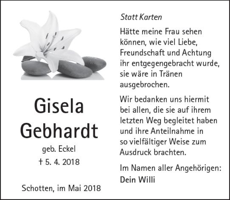 Hier finden Sie alle Traueranzeigen aus der Zeitung, die bisher für Giesela Gebhardt erschienen sind. Weitere Traueranzeigen, die in der Zeitung erscheinen, werden hier ebenfalls aufgelistet