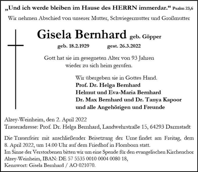 Hier finden Sie alle Traueranzeigen aus der Zeitung, die bisher für Gisela Bernhard erschienen sind. Weitere Traueranzeigen, die in der Zeitung erscheinen, werden hier ebenfalls aufgelistet