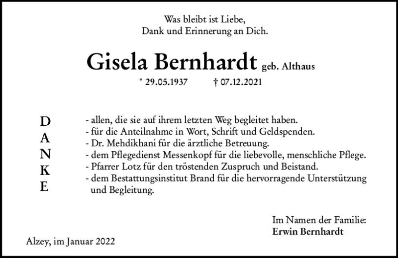 Hier finden Sie alle Traueranzeigen aus der Zeitung, die bisher für Gisela Bernhardt erschienen sind. Weitere Traueranzeigen, die in der Zeitung erscheinen, werden hier ebenfalls aufgelistet
