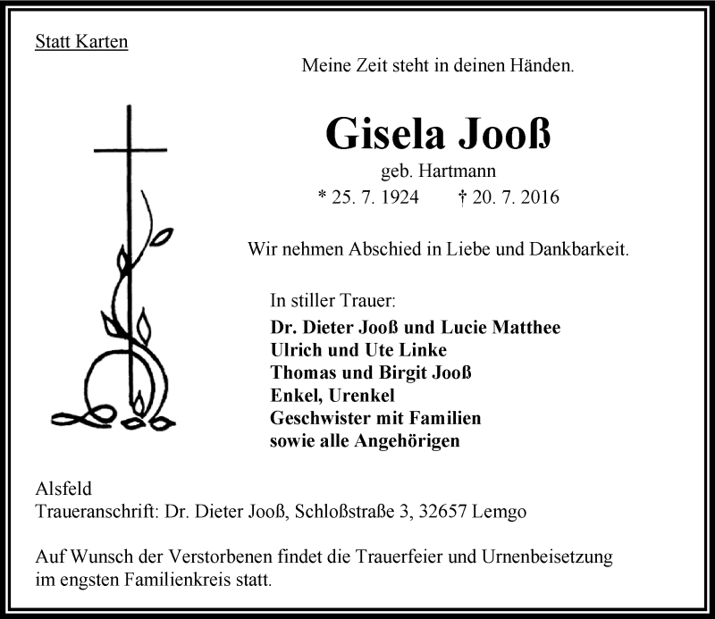 Hier finden Sie alle Traueranzeigen aus der Zeitung, die bisher für Gisela Jooß erschienen sind. Weitere Traueranzeigen, die in der Zeitung erscheinen, werden hier ebenfalls aufgelistet