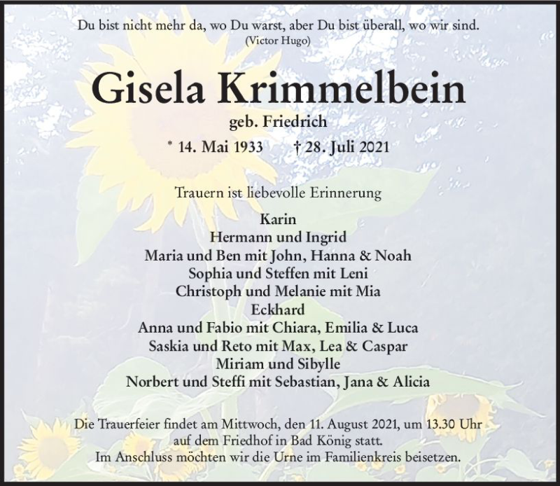 Hier finden Sie alle Traueranzeigen aus der Zeitung, die bisher für Gisela Krimmelbein erschienen sind. Weitere Traueranzeigen, die in der Zeitung erscheinen, werden hier ebenfalls aufgelistet