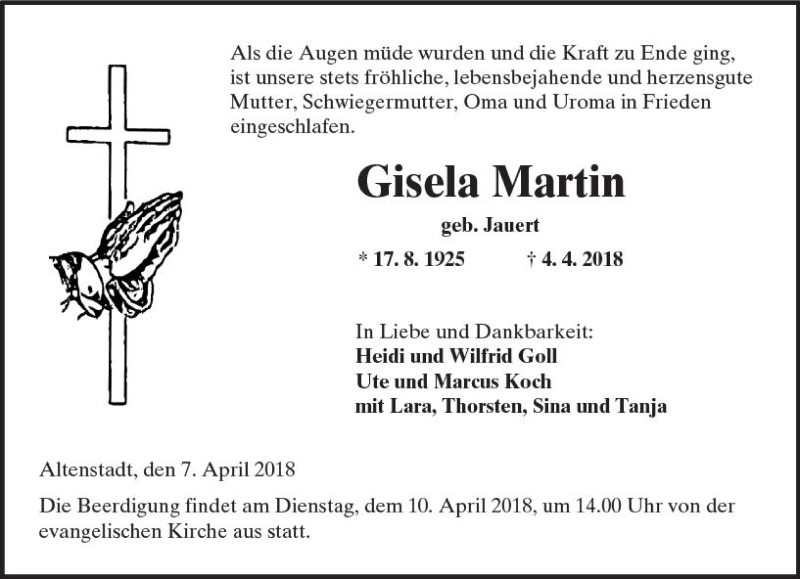 Hier finden Sie alle Traueranzeigen aus der Zeitung, die bisher für Gisela Martin erschienen sind. Weitere Traueranzeigen, die in der Zeitung erscheinen, werden hier ebenfalls aufgelistet