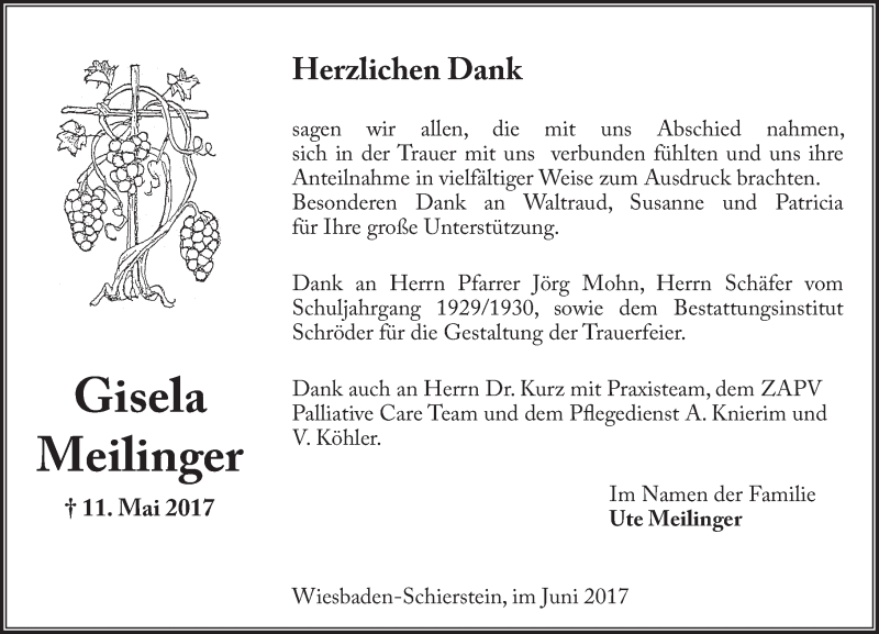 Hier finden Sie alle Traueranzeigen aus der Zeitung, die bisher für Gisela Meilinger erschienen sind. Weitere Traueranzeigen, die in der Zeitung erscheinen, werden hier ebenfalls aufgelistet