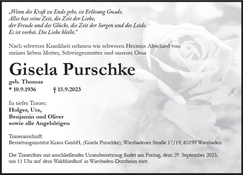 Hier finden Sie alle Traueranzeigen aus der Zeitung, die bisher für Gisela Purschke erschienen sind. Weitere Traueranzeigen, die in der Zeitung erscheinen, werden hier ebenfalls aufgelistet