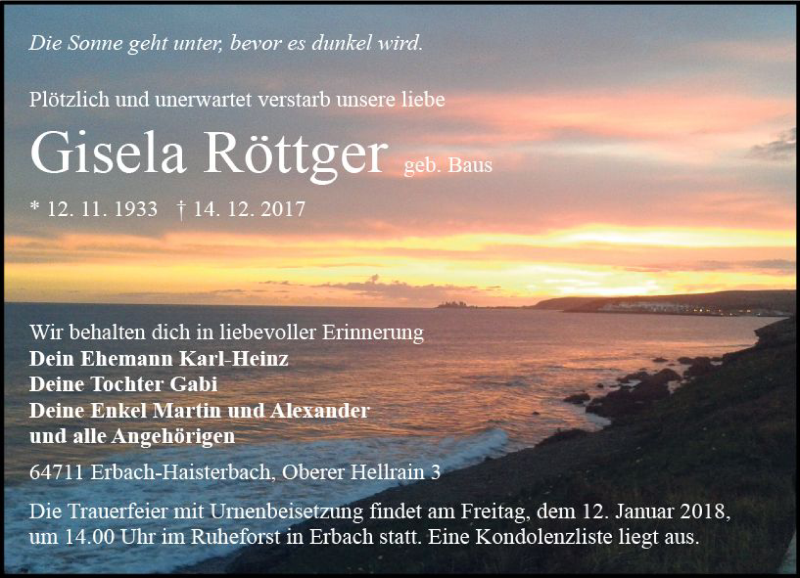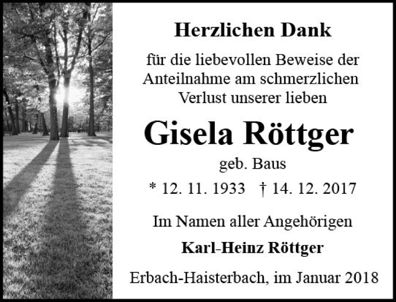 Hier finden Sie alle Traueranzeigen aus der Zeitung, die bisher für Gisela Röttger erschienen sind. Weitere Traueranzeigen, die in der Zeitung erscheinen, werden hier ebenfalls aufgelistet