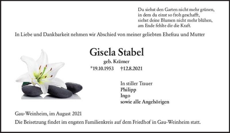 Hier finden Sie alle Traueranzeigen aus der Zeitung, die bisher für Gisela Stabel erschienen sind. Weitere Traueranzeigen, die in der Zeitung erscheinen, werden hier ebenfalls aufgelistet