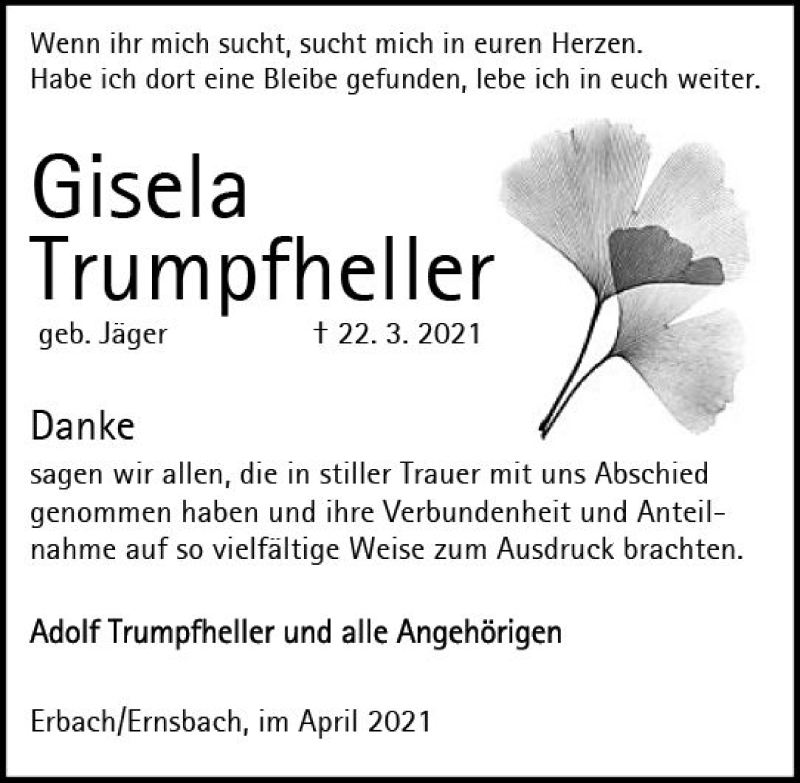 Hier finden Sie alle Traueranzeigen aus der Zeitung, die bisher für Gisela Trumpfheller erschienen sind. Weitere Traueranzeigen, die in der Zeitung erscheinen, werden hier ebenfalls aufgelistet