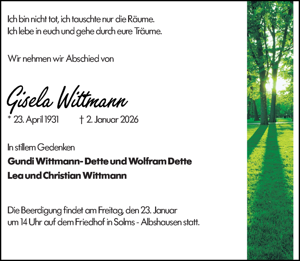 Hier finden Sie alle Traueranzeigen aus der Zeitung, die bisher für Gisela Wittmann erschienen sind. Weitere Traueranzeigen, die in der Zeitung erscheinen, werden hier ebenfalls aufgelistet