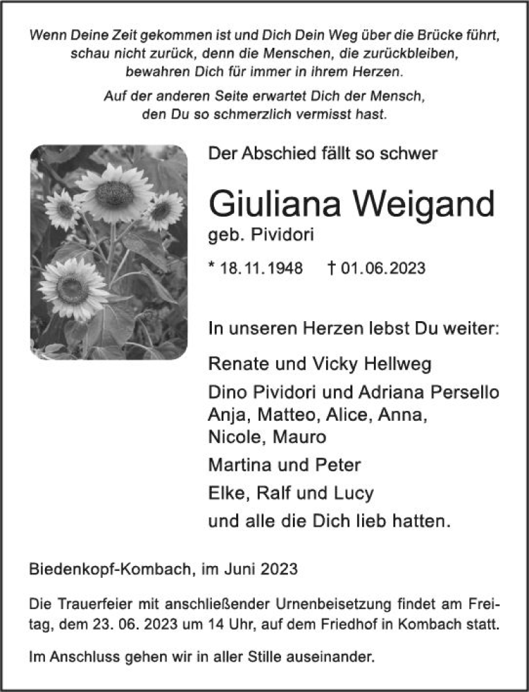 Hier finden Sie alle Traueranzeigen aus der Zeitung, die bisher für Giuliana Weigand erschienen sind. Weitere Traueranzeigen, die in der Zeitung erscheinen, werden hier ebenfalls aufgelistet
