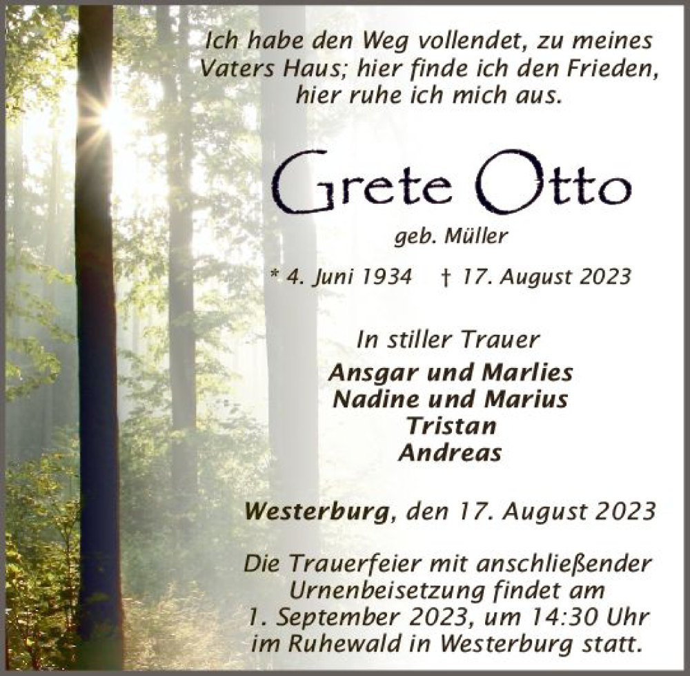 Hier finden Sie alle Traueranzeigen aus der Zeitung, die bisher für Grete Otto erschienen sind. Weitere Traueranzeigen, die in der Zeitung erscheinen, werden hier ebenfalls aufgelistet
