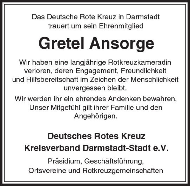 Hier finden Sie alle Traueranzeigen aus der Zeitung, die bisher für Gretel Ansorge erschienen sind. Weitere Traueranzeigen, die in der Zeitung erscheinen, werden hier ebenfalls aufgelistet