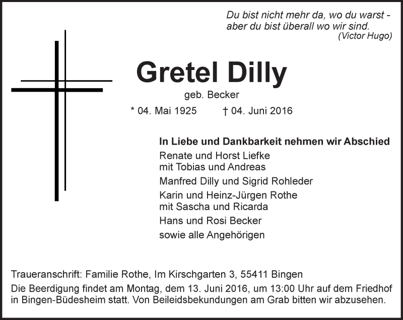 Hier finden Sie alle Traueranzeigen aus der Zeitung, die bisher für Gretel Dilly erschienen sind. Weitere Traueranzeigen, die in der Zeitung erscheinen, werden hier ebenfalls aufgelistet