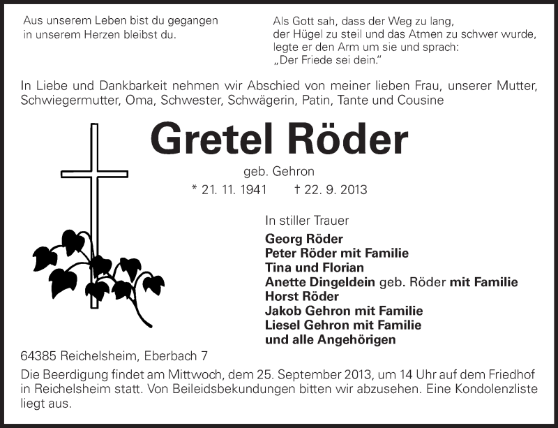 Hier finden Sie alle Traueranzeigen aus der Zeitung, die bisher für Gretel Röder erschienen sind. Weitere Traueranzeigen, die in der Zeitung erscheinen, werden hier ebenfalls aufgelistet