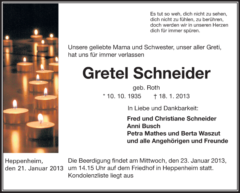 Hier finden Sie alle Traueranzeigen aus der Zeitung, die bisher für Gretel Schneider erschienen sind. Weitere Traueranzeigen, die in der Zeitung erscheinen, werden hier ebenfalls aufgelistet