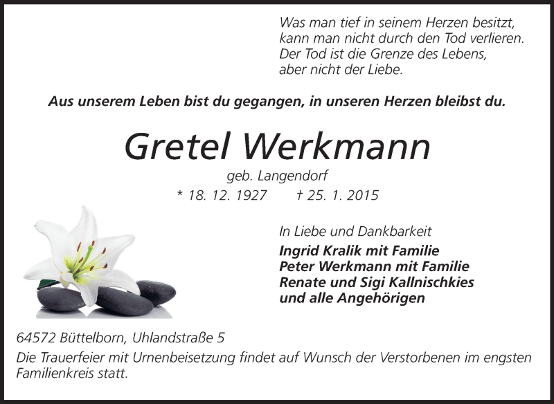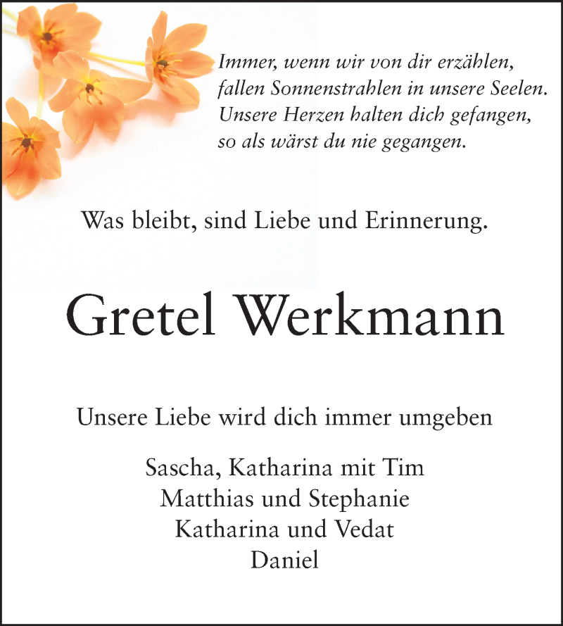 Hier finden Sie alle Traueranzeigen aus der Zeitung, die bisher für Gretel Werkmann erschienen sind. Weitere Traueranzeigen, die in der Zeitung erscheinen, werden hier ebenfalls aufgelistet