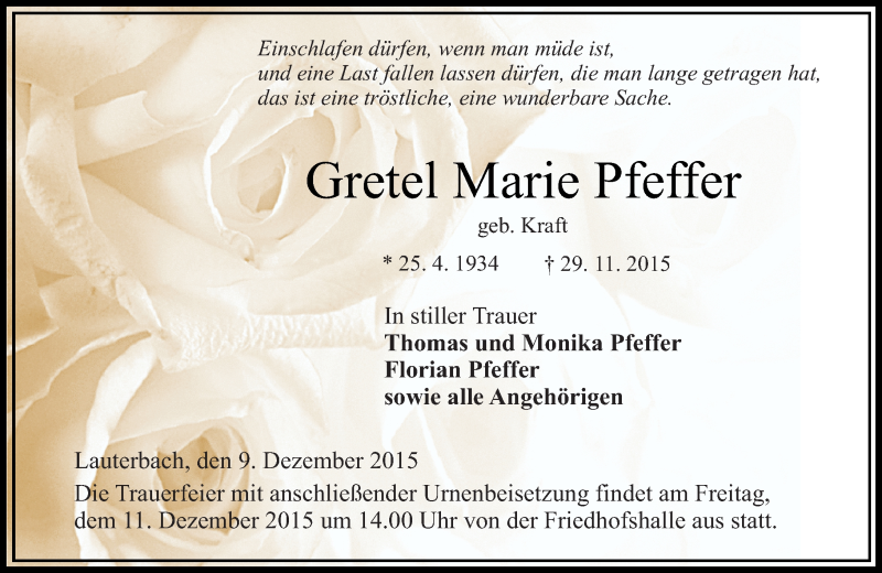 Hier finden Sie alle Traueranzeigen aus der Zeitung, die bisher für Gretel Marie Pfeffer erschienen sind. Weitere Traueranzeigen, die in der Zeitung erscheinen, werden hier ebenfalls aufgelistet