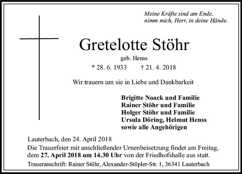 Hier finden Sie alle Traueranzeigen aus der Zeitung, die bisher für Gretelotte Stöhr erschienen sind. Weitere Traueranzeigen, die in der Zeitung erscheinen, werden hier ebenfalls aufgelistet
