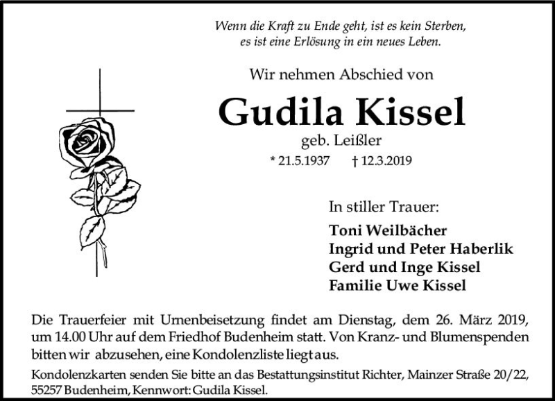 Hier finden Sie alle Traueranzeigen aus der Zeitung, die bisher für Gudila Kissel erschienen sind. Weitere Traueranzeigen, die in der Zeitung erscheinen, werden hier ebenfalls aufgelistet