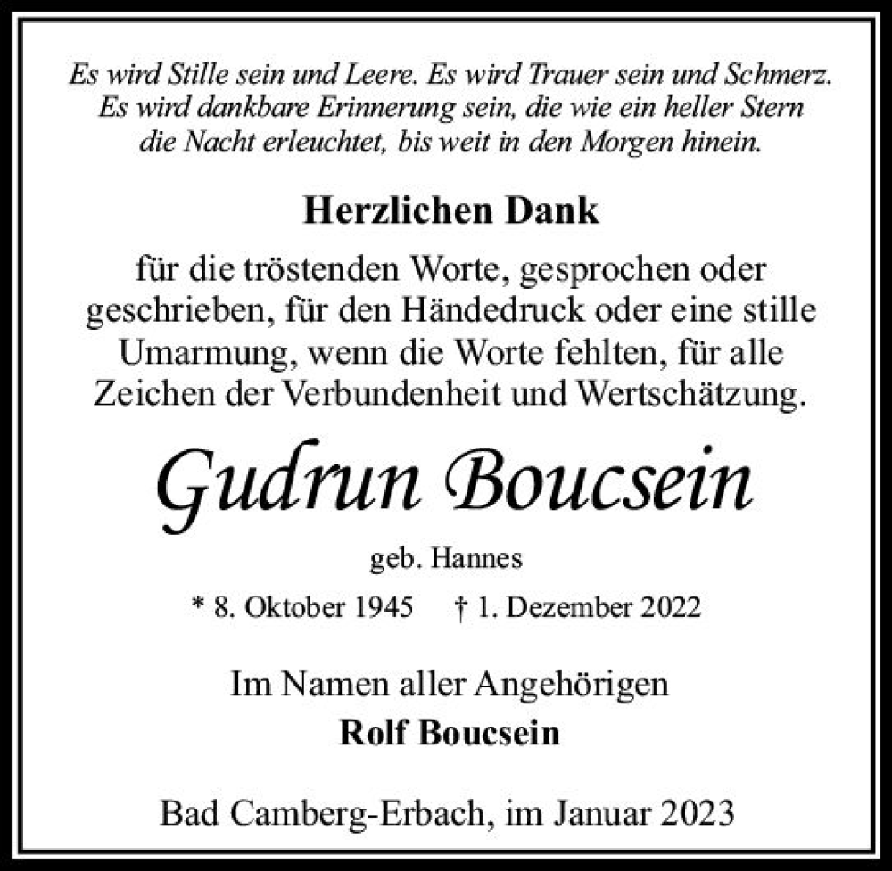 Hier finden Sie alle Traueranzeigen aus der Zeitung, die bisher für Gudrun Boucsein erschienen sind. Weitere Traueranzeigen, die in der Zeitung erscheinen, werden hier ebenfalls aufgelistet