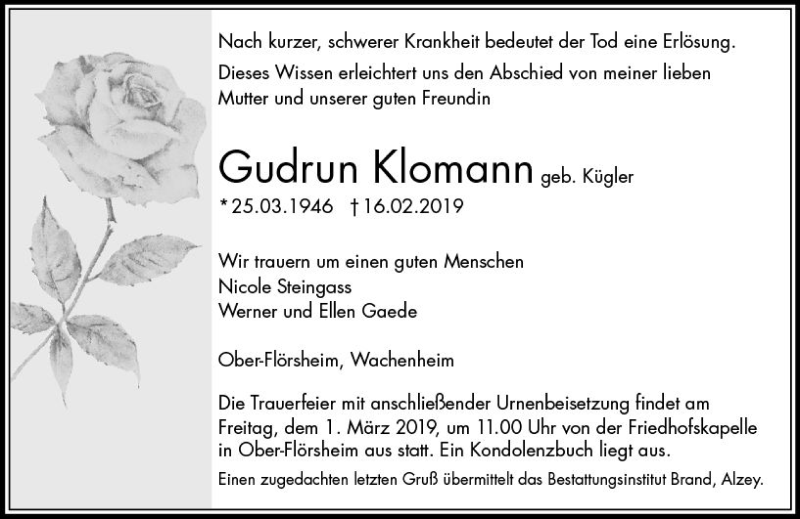 Hier finden Sie alle Traueranzeigen aus der Zeitung, die bisher für Gudrun Klomann erschienen sind. Weitere Traueranzeigen, die in der Zeitung erscheinen, werden hier ebenfalls aufgelistet
