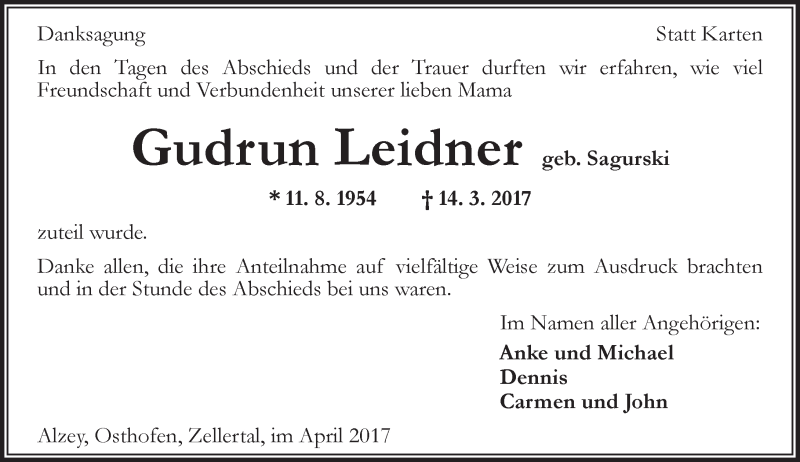 Hier finden Sie alle Traueranzeigen aus der Zeitung, die bisher für Gudrun Leidner erschienen sind. Weitere Traueranzeigen, die in der Zeitung erscheinen, werden hier ebenfalls aufgelistet
