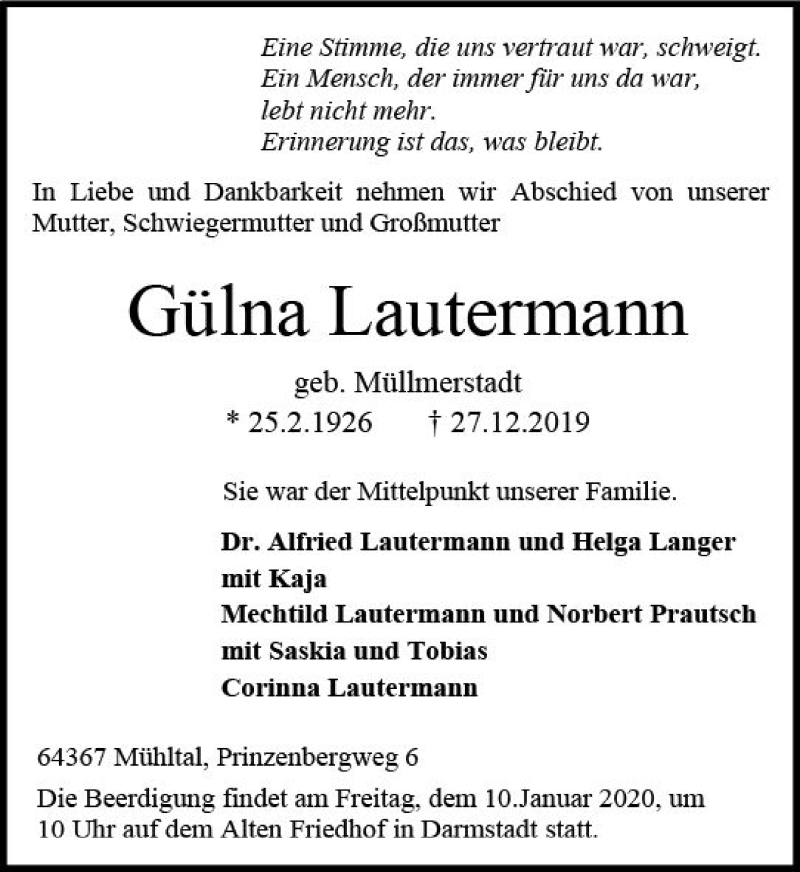 Hier finden Sie alle Traueranzeigen aus der Zeitung, die bisher für Gülna Lautermann erschienen sind. Weitere Traueranzeigen, die in der Zeitung erscheinen, werden hier ebenfalls aufgelistet