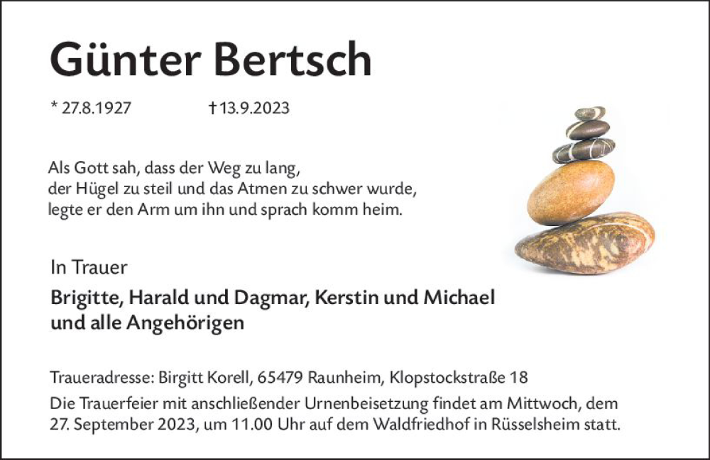 Hier finden Sie alle Traueranzeigen aus der Zeitung, die bisher für Günter Bertsch erschienen sind. Weitere Traueranzeigen, die in der Zeitung erscheinen, werden hier ebenfalls aufgelistet