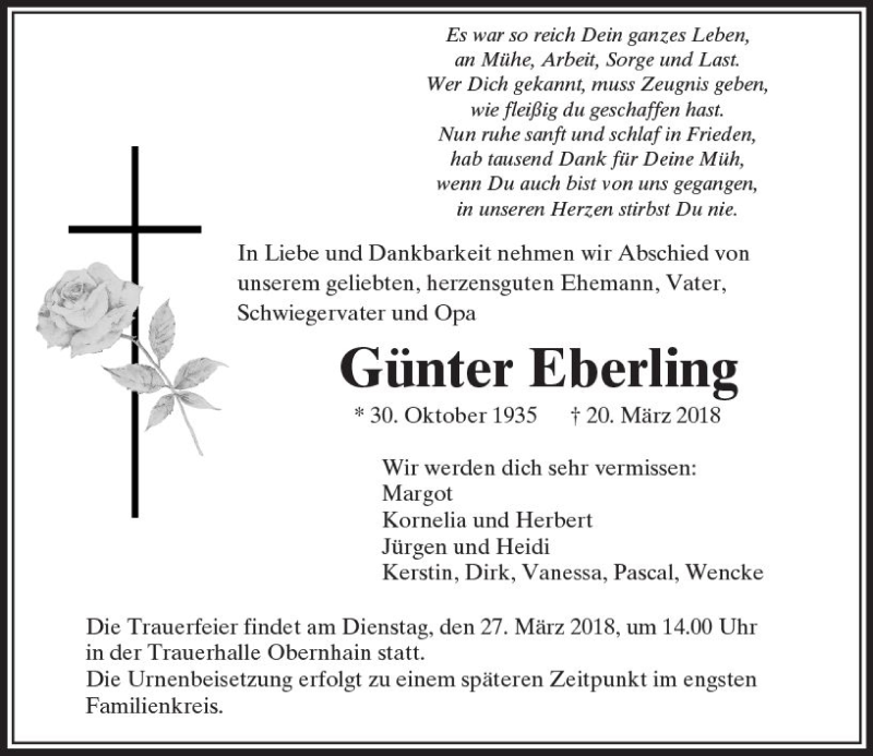 Hier finden Sie alle Traueranzeigen aus der Zeitung, die bisher für Günter Eberling erschienen sind. Weitere Traueranzeigen, die in der Zeitung erscheinen, werden hier ebenfalls aufgelistet