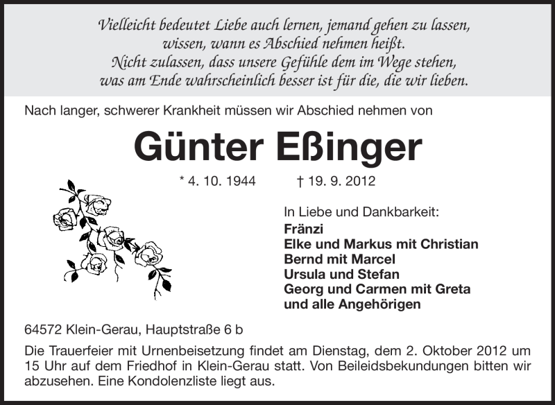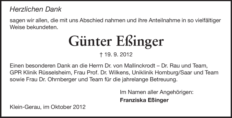 Hier finden Sie alle Traueranzeigen aus der Zeitung, die bisher für Günter Eßinger erschienen sind. Weitere Traueranzeigen, die in der Zeitung erscheinen, werden hier ebenfalls aufgelistet